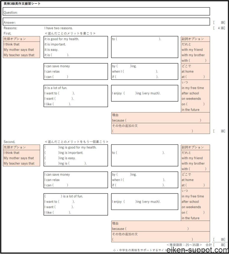 単語やフレーズの選択、穴埋めのみで簡単に英検3級の英作文を完成させることが出来ます