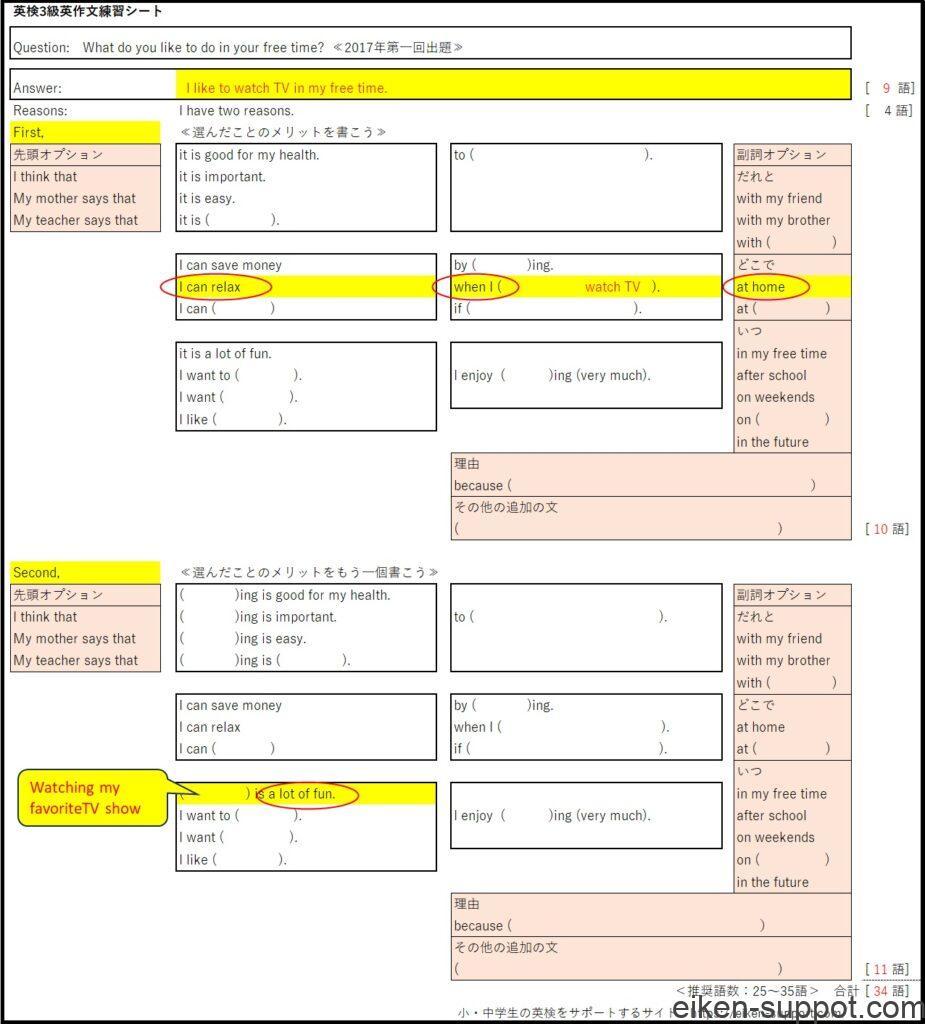 I like to watch TV in my free time. I have two reasons. First, I can relax when I watch TV at home. Second, watching my favorite TV show is a lot of fun. [34語]